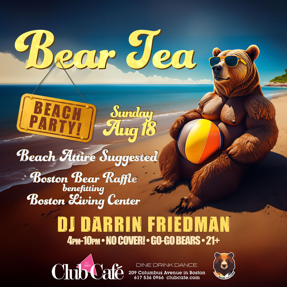 BEAR TEA BEACH PARTY! – Beach Attire Suggested. Boston Bear Raffle benefitting Boston Living Center. Club Café welcomes the Bear and Otter community on the 3rd Sunday every month. Music by DJ DARRIN FRIEDMAN. No Cover. G0-G0 Bears – 21+