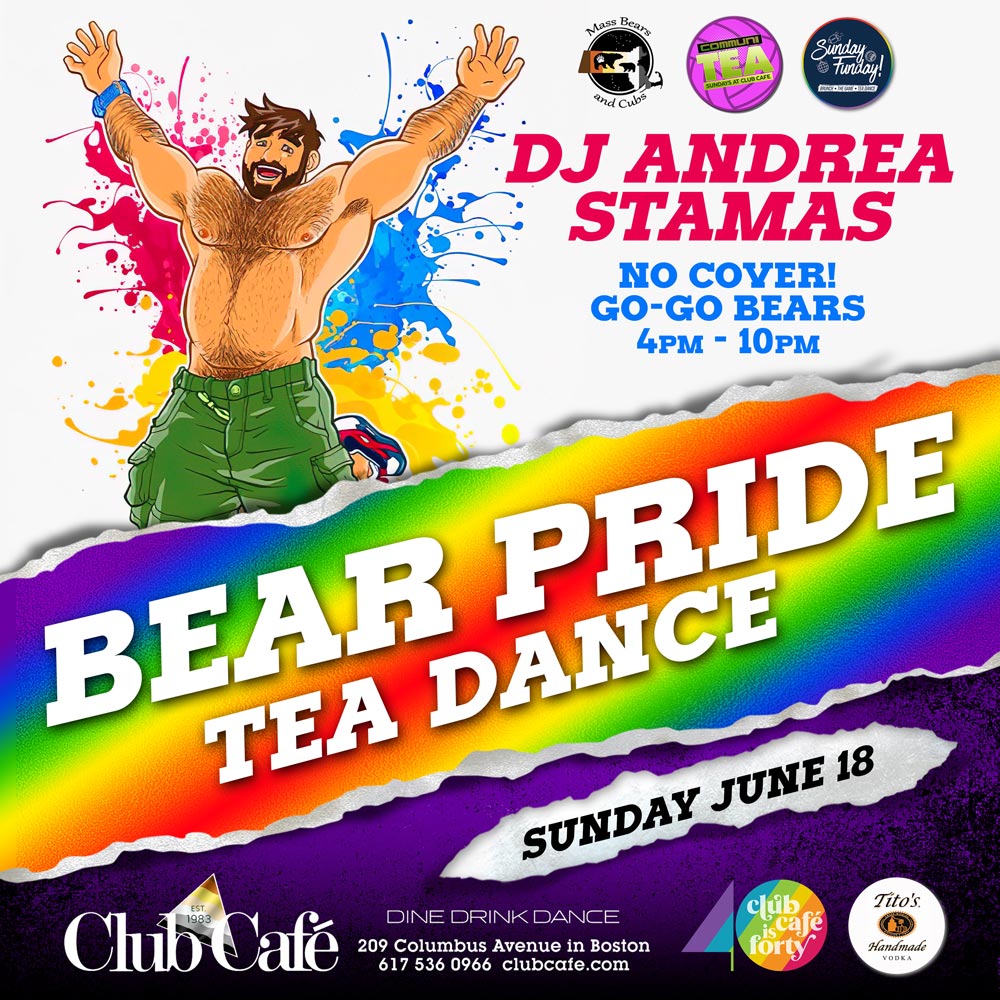 BEAR PRIDE TEA DANCE – Club Café welcomes the Bear and Otter community on the 3rd Sunday every month. Music by DJ ANDREA STAMAS. No Cover. GO-GO’S