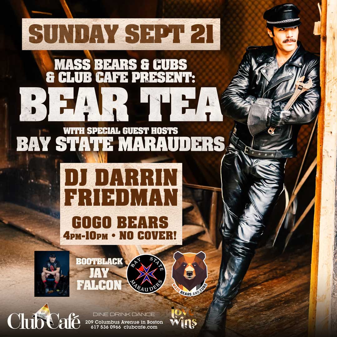 Bear Tea – With special guest hosts BAY STATE MARAUDERS – Club Café welcomes the Bear and Otter community on the 3rd Sunday every month. Music by DJ DARRIN FRIEDMAN. No Cover. GO-GO Bears