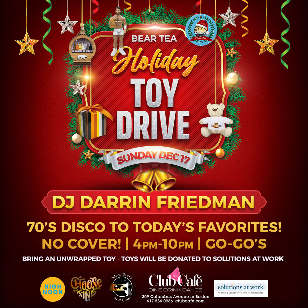 BEAR TEA HOLIDAY TOY DRIVE – Club Café welcomes the Bear and Otter community on the 3rd Sunday every month. Music by DJ DARRIN FRIEDMAN. No Cover. GO-GO’S