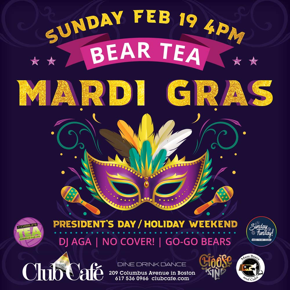 BEAR TEA MARDI GRAS – Club Café welcomes the Bear and Otter community on the 3rd Sunday every month. Music by DJ AGA. No Cover. GO-GO’S