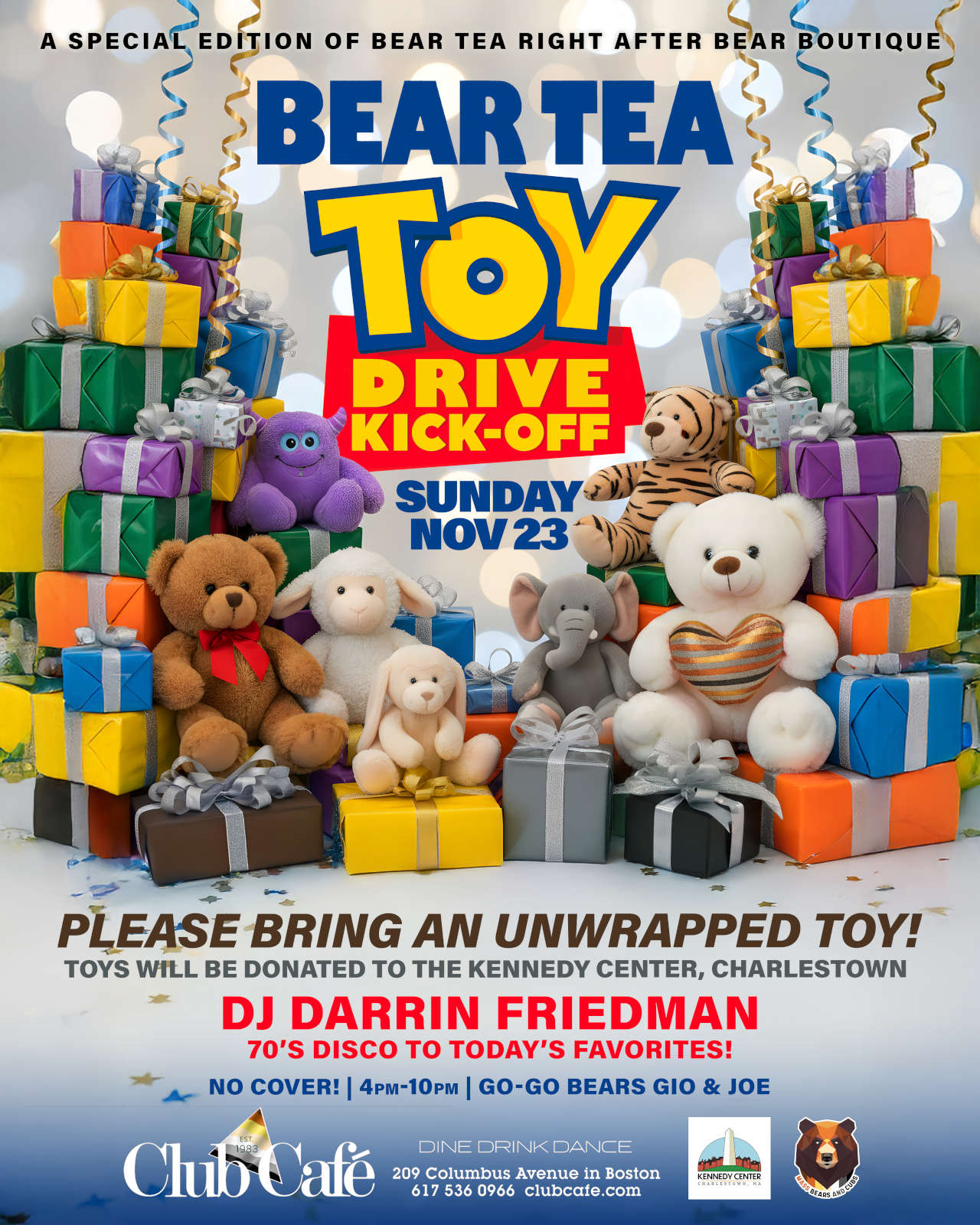 BEAR TEA TOY DRIVE – A special edition of Bear Tea right after Bear Boutique. Please bring an unwrapped toy. Toys will be donated to the Kennedy Center, Charlestown. Music by DJ DARRIN FRIEDMAN. No Cover.