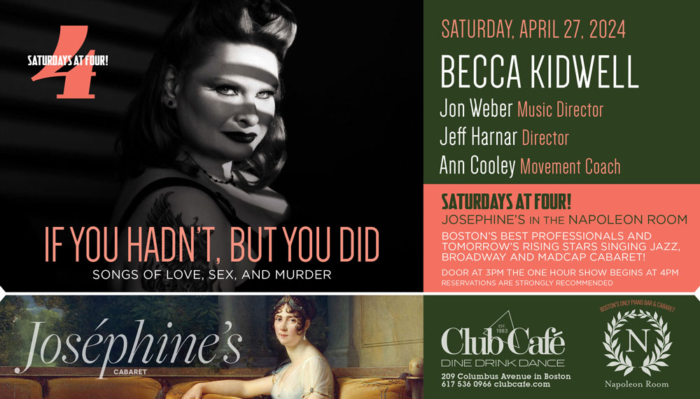 JOSEPHINE’S in the NAPOLEON ROOM – Boston’s best professionals and tomorrow’s rising stars singing JAZZ, BROADWAY & MADCAP CABARET! Doors open at 3pm and the one hour show begins at 4:00 pm. RESERVATIONS strongly recommended.