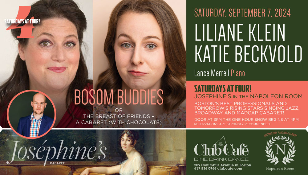 JOSEPHINE’S in the NAPOLEON ROOM – Boston’s best professionals and tomorrow’s rising stars singing JAZZ, BROADWAY & MADCAP CABARET! Doors open at 3pm and the one hour show begins at 4:00 pm. RESERVATIONS strongly recommended.