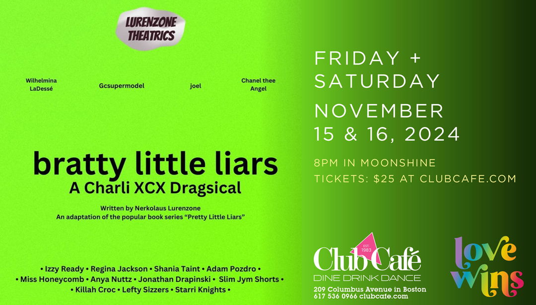 A LIMITED NUMBER OF TICKETS MAY BE AVAILABLE AT THE DOOR. PLEASE CHECK WITH CLUB CAFE FOR AVAILABILITY Lurenzone Theatrics takes on it’s final production with “Bratty Little Liars” an original adaptation of the popular book and television series, ‘Pretty Little Liars’ set to the music of Charli XCX. Following the disappearance of their best friend Alison DiLaurentis, our four bratty little liars Aria, Hannah, Spencer, and Emily have been receiving mysterious texts about their lives all signed by the same anonymous “A”. Join us as we take you on a mysterious journey to figure out what happened to Alison and most importantly, who is “A”?