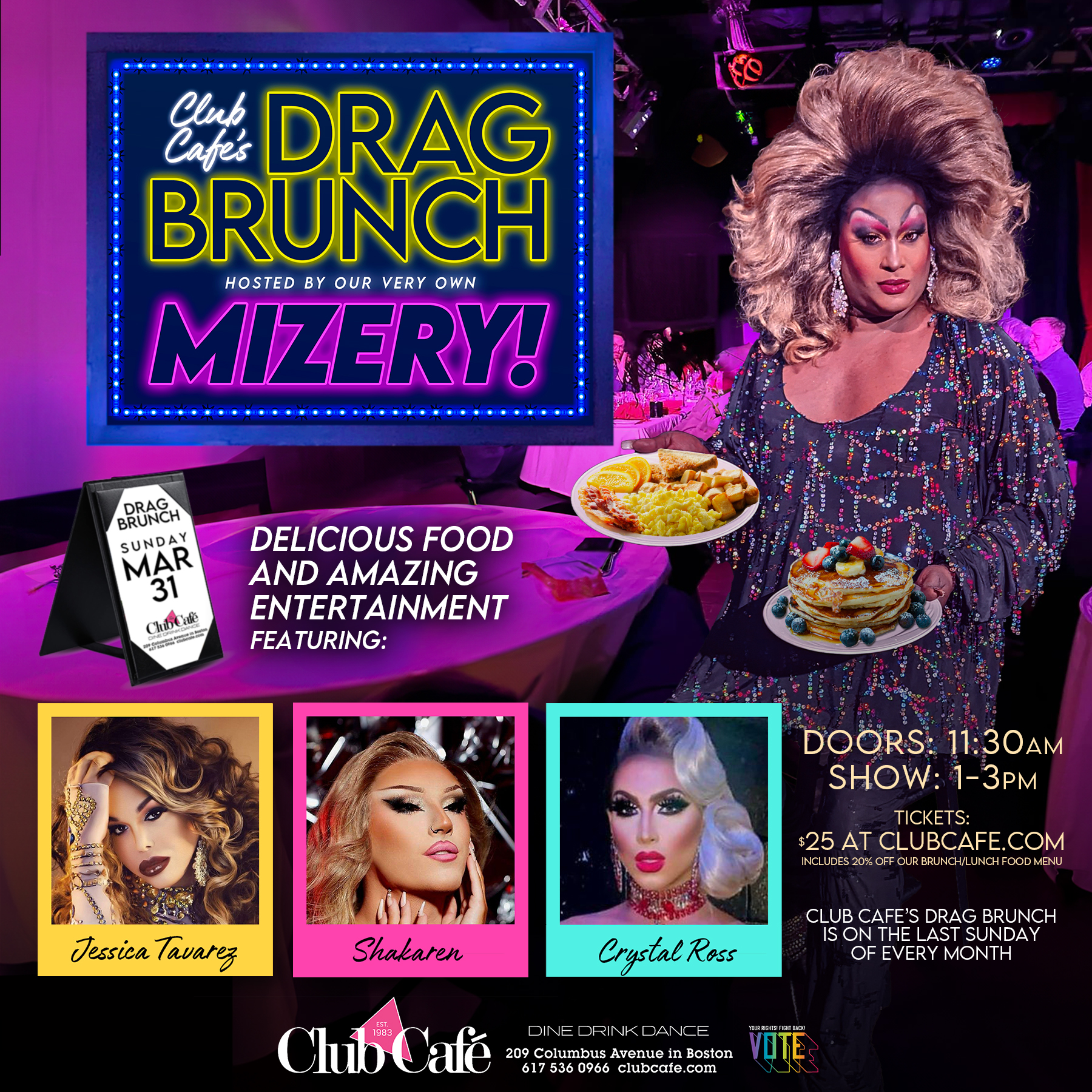 Hosted by MIZERY! featuring very special guests JESSICA TAVAREZ, SHAKAREN, , and CRYSTAL ROSS . $25 includes 20% off our Brunch / Lunch food menu. Doors at 11:30am, show 1-3pm.