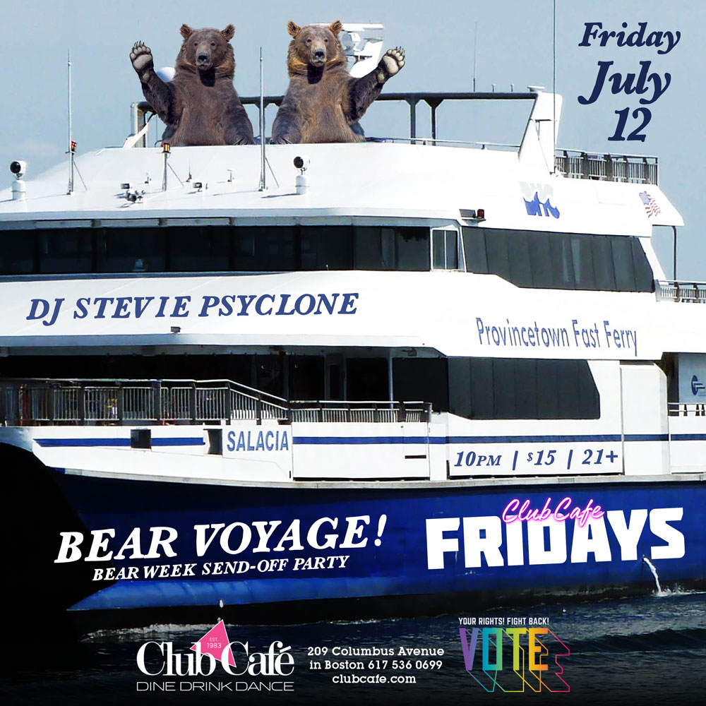 BEAR VOYAGE! Bear Week Send-off Party. Join us at Club Café as we kick off the weekend with DJ STEVIE PSYCLONE.