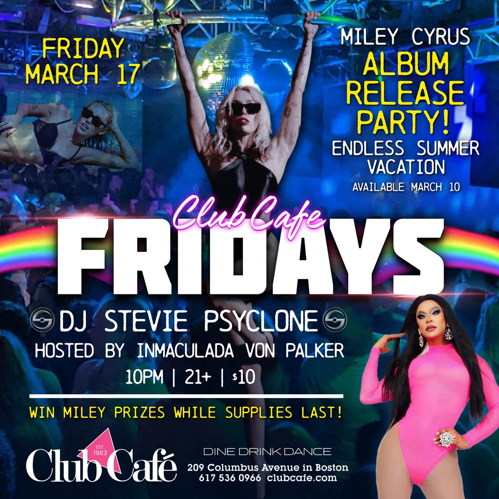 MILEY CYRUS ALBUM RELEASE PARTY! Endless Summer Vacation. Join us at Club Café as we kick off the weekend with DJ STEVIE PSYCLONE and your host IMMACULADA VON PALKER. Dancing at 10PM, $10 cover