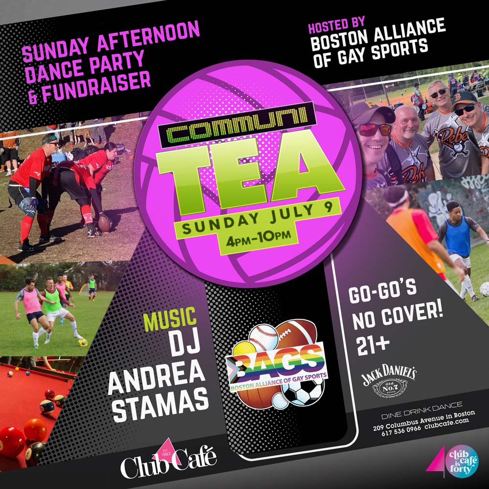 COMMUNI-TEA DANCE with DJ Andrea Stamas – A Sunday Afternoon Dance Party, Hosted by Boston Alliance of Gay Sports – 4pm-10pm. No Cover go-go’s – 21+