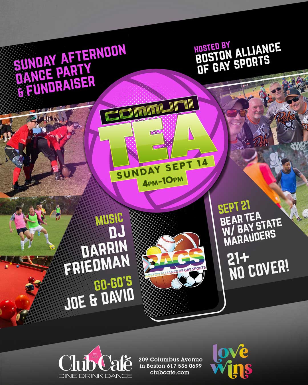 COMMUNI-TEA DANCE with DJ DARRIN FRIEDMAN – A Sunday Afternoon Dance Party Hosted by BOSTON ALLIANCE OF GAY SPORTS. – 4pm-10pm. No Cover go-go’s – 21+
