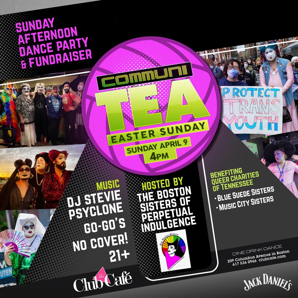 EASTER COMMUNI-TEA DANCE – A Sunday Afternoon Dance Party, 4pm-8pm. Music by DJ STEVIE PSYCLONE, hosted by The Boston Sisters of Perepetual Indulgence, go-go’s NO COVER! 21+