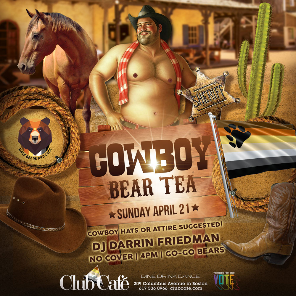 COWBOY BEAR TEA – Cowboy hats or attire suggested. Club Café welcomes the Bear and Otter community on the 3rd Sunday every month. Music by DJ DARRIN FRIEDMAN. No Cover. G0-G0 Bears – 21+