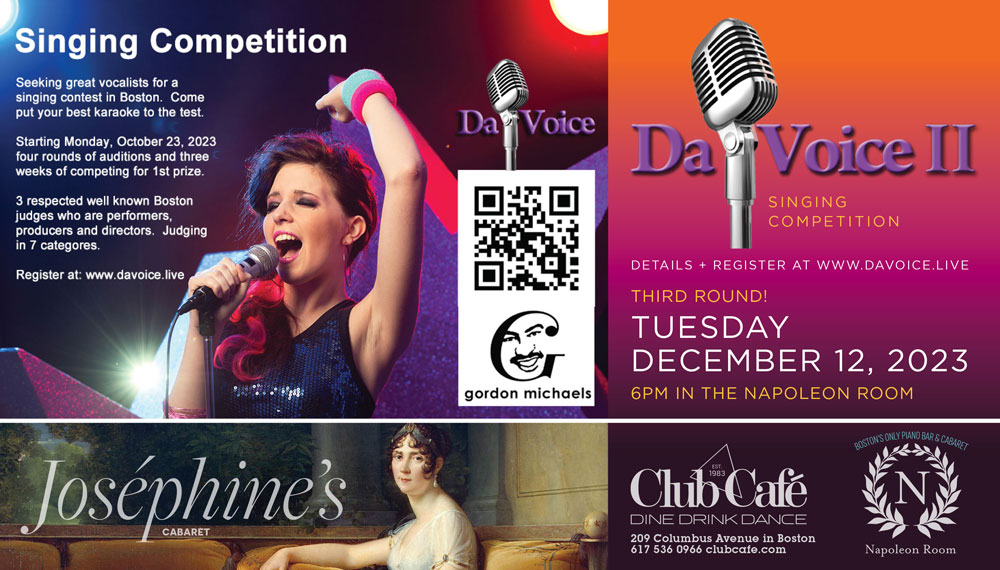 The 2nd season of DaVoice singing competition produced & hosted by our very own resident singer Gordon Michaels has moved from Quincy, MA to Boston. Sign up and register NOW to be the next DaVoice winner at www.DaVoice.live . The 1st place Grand Prize package is worth $2100.00. Don’t wait. Come out and be the next new singer to perform a solo show at Club Café. Final set of Auditions are Dec.12th. Still room for a few more. Break a leg!