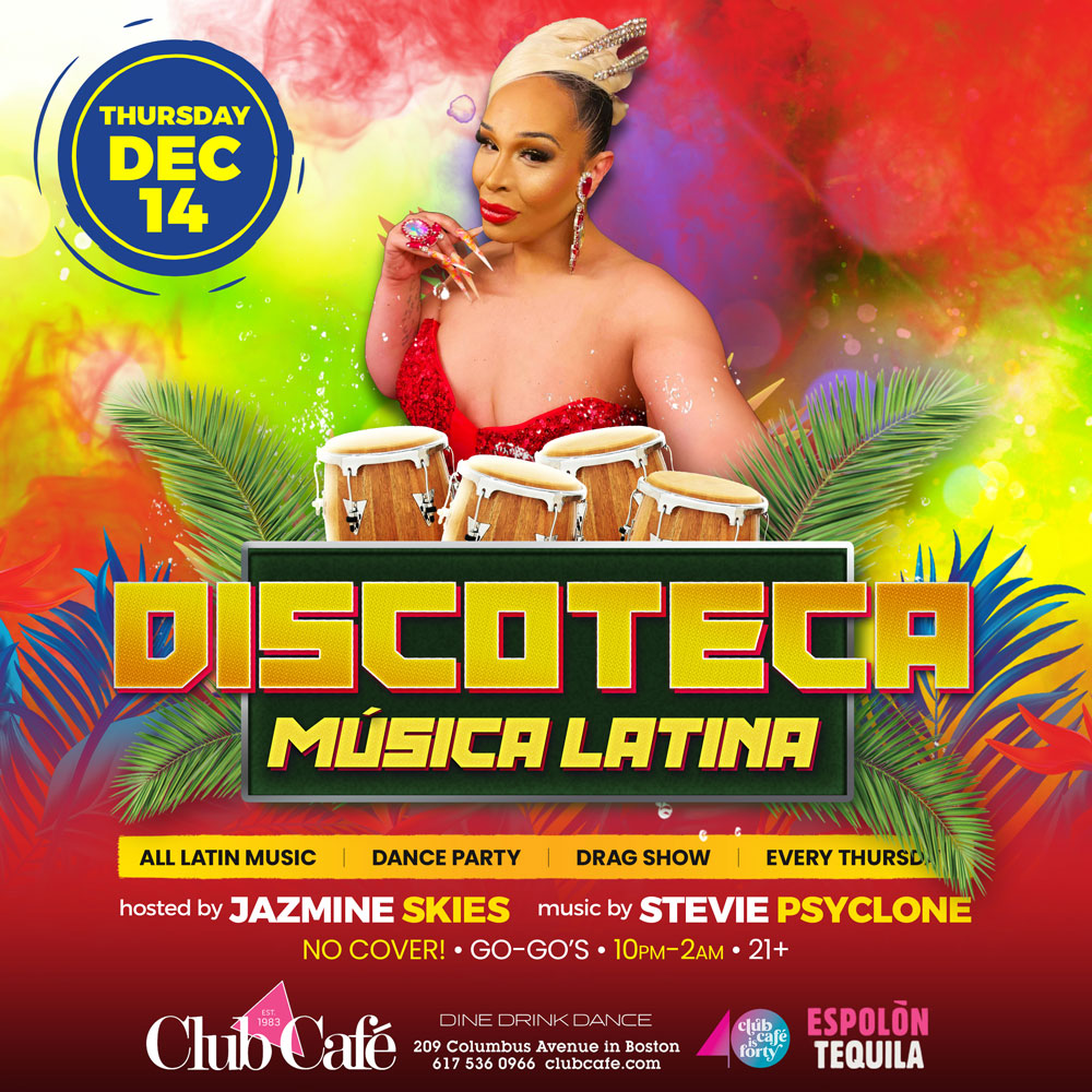 DISCOTECA – Weekly Latin Music Dance Party & Drag Show. – Music by DJ STEVIE PSYCLONE & Hosted by JAZMINE SKIES. No Cover! Go-Go’s
