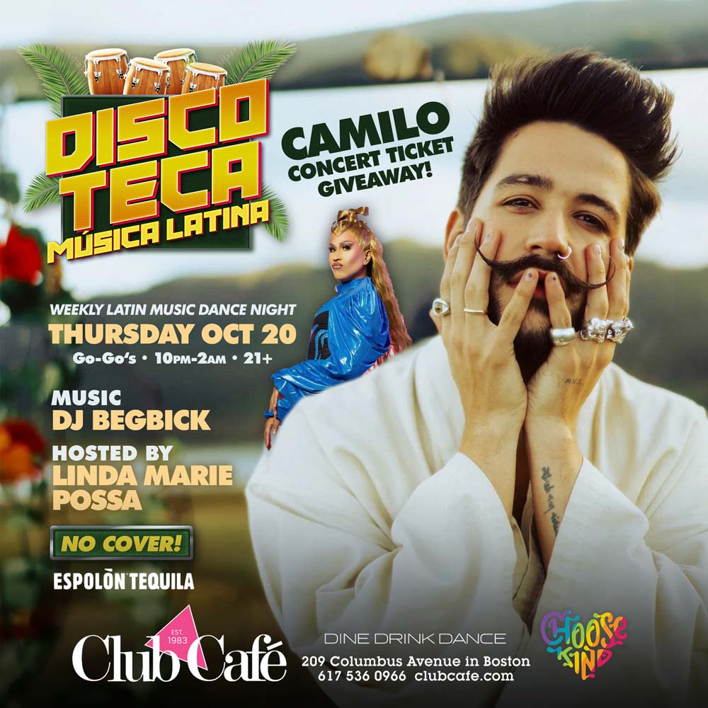 CAMILO CONCERT TICKET GIVEAWAY! – Weekly Latin Music Dance Party. – Music by DJ BEGBICK & Hosted by LINDA MARIE POSSA. No Cover! Go-Go’s