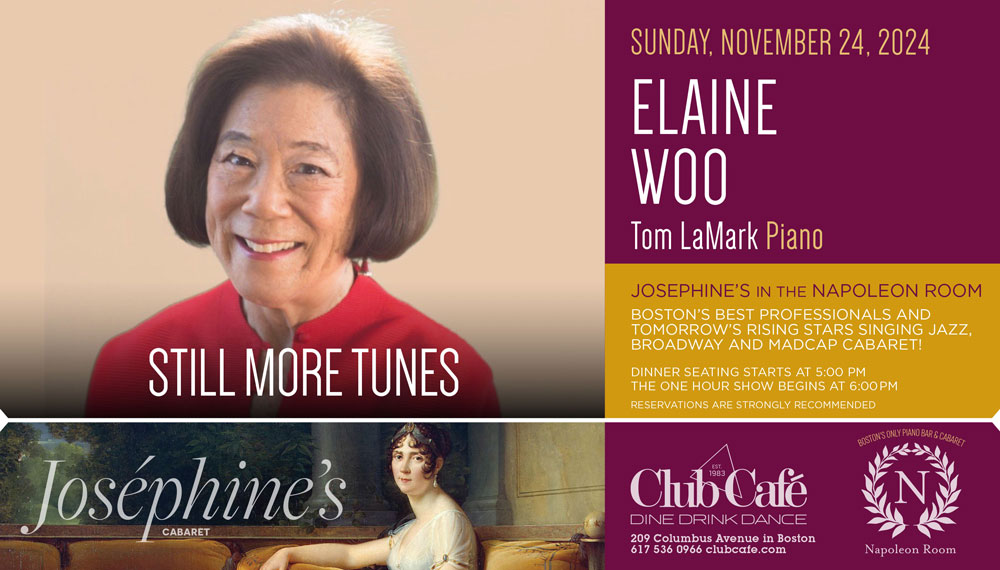 JOSEPHINE’S in the NAPOLEON ROOM – Boston’s best professionals and tomorrow’s rising stars singing JAZZ, BROADWAY & MADCAP CABARET! Dinner seating starts at 5:00 pm and the one hour show begins at 6:00 pm. RESERVATIONS strongly recommended.
