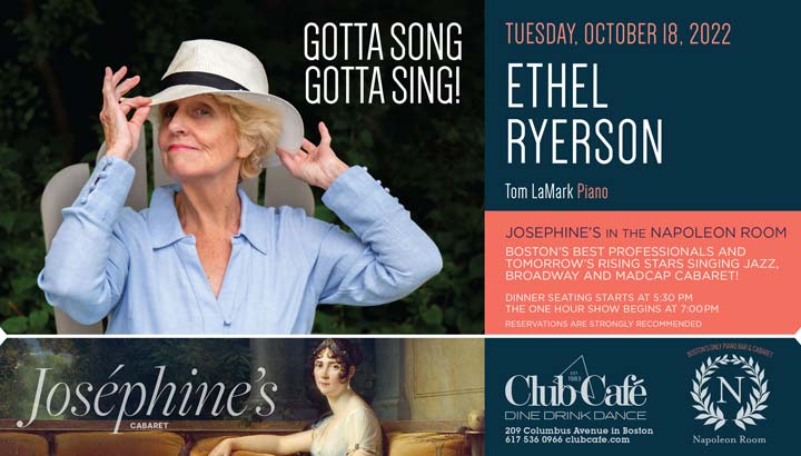 JOSEPHINE’S in the NAPOLEON ROOM – Boston’s best professionals and tomorrow’s rising stars singing JAZZ, BROADWAY & MADCAP CABARET! Dinner seating starts at 5:30 pm and the one hour show begins at 7:00 pm. RESERVATIONS strongly recommended.