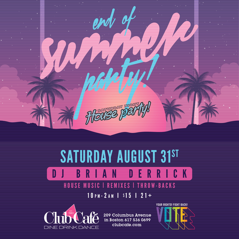 Saturday Night House Party presents the END OF SUMMER PARTY PARTY. Music by DJ BRIAN DERRICK , Dance floor opens at 10PM – House Remixes – $15 cover after 10pm