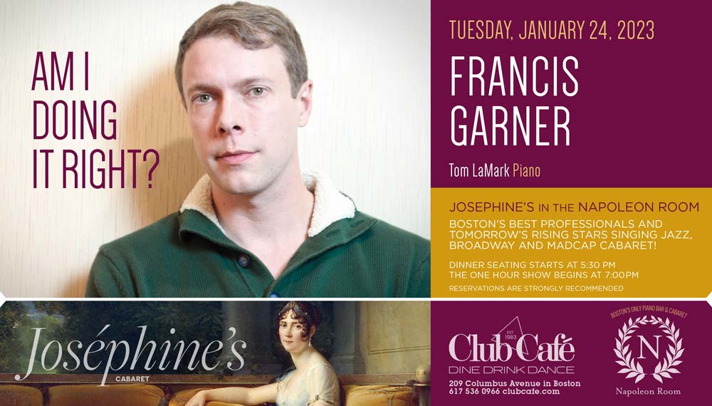 JOSEPHINE’S in the NAPOLEON ROOM – Boston’s best professionals and tomorrow’s rising stars singing JAZZ, BROADWAY & MADCAP CABARET! Dinner seating starts at 5:30 pm and the one hour show begins at 7:00 pm. RESERVATIONS strongly recommended.