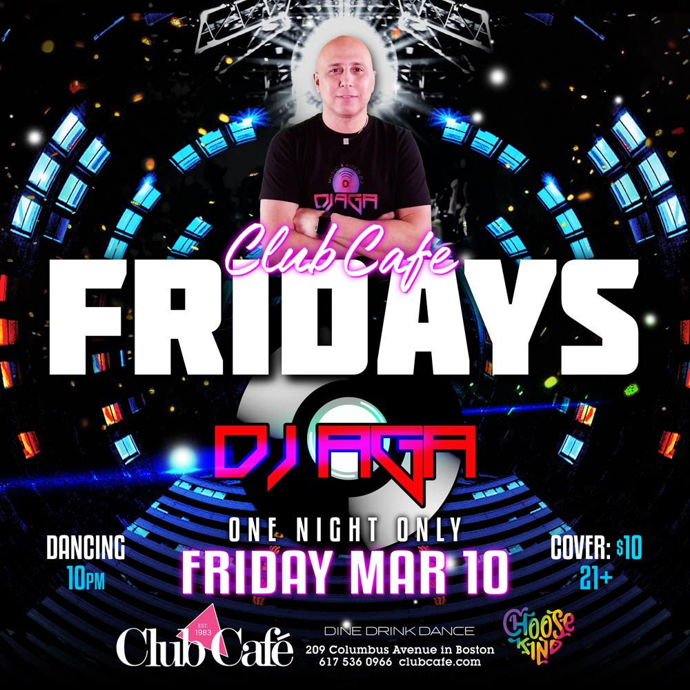 Join us at Club Café as we kick off the weekend with DJ AGA. Dancing at 10PM, $10 cover