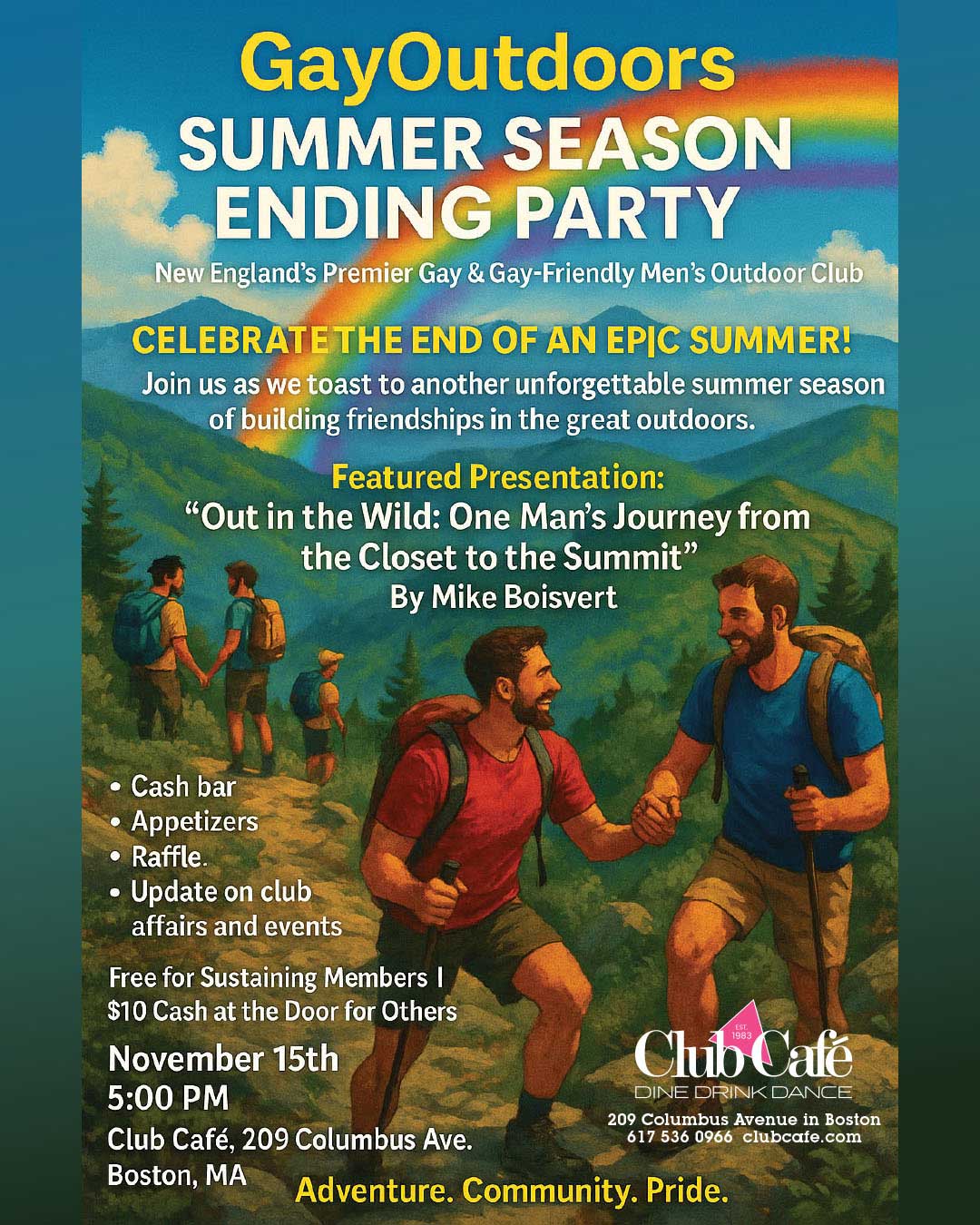 Join us as we toast to another unforgettable season of hiking, trail maintenance, tubing, ziplining, swimming, and building friendships in the great outdoors. Whether you’ve been with us every step of the way or are just discovering GayOutdoors, this is your chance to connect, reflect, and celebrate with your trail family.