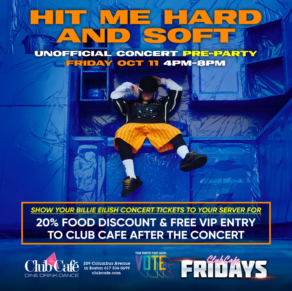 Show ;your Billie Eilish concert tickets to your server for 20% food discount & FREE VIP ENTRY to Club Café after the concert.