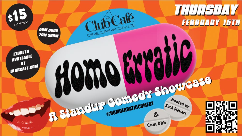 Cam Ohh and Zach Stewart host a lineup compromised of hilarious and talented comedians at Club Cafe. Come for a night of laughs or at least for the 20% food orders. And for more information about this show and upcoming shows, follow @homoerraticcomedy on Instagram