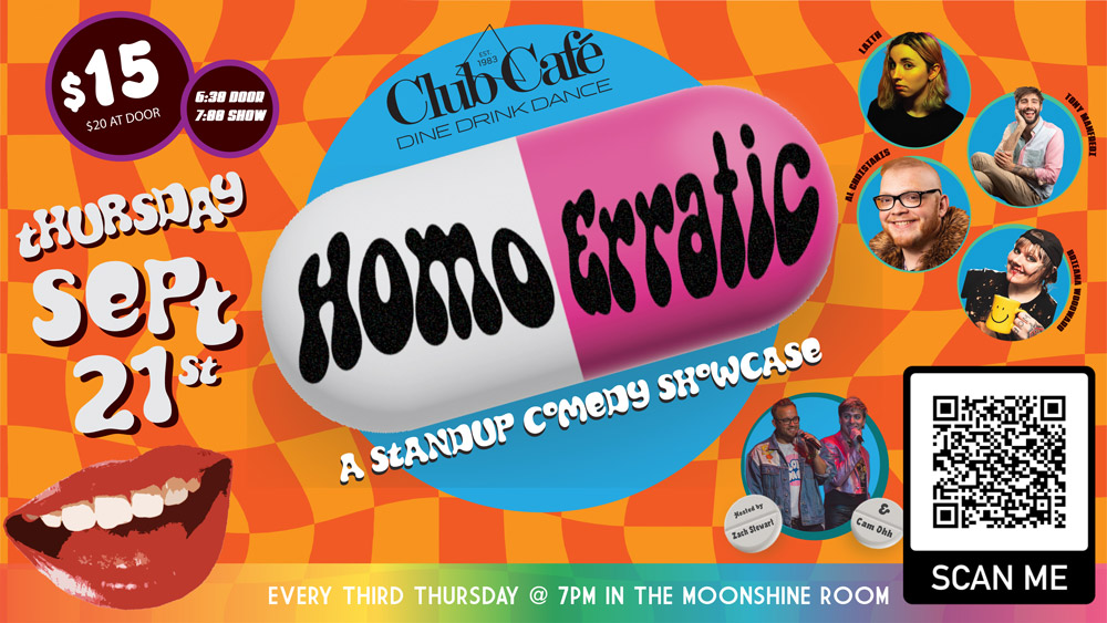 Queer comics Cam Ohh and Zach Stewart host Boston’s best stand-up comedians at Club Cafe for a night of hilarity and homosexual behavior