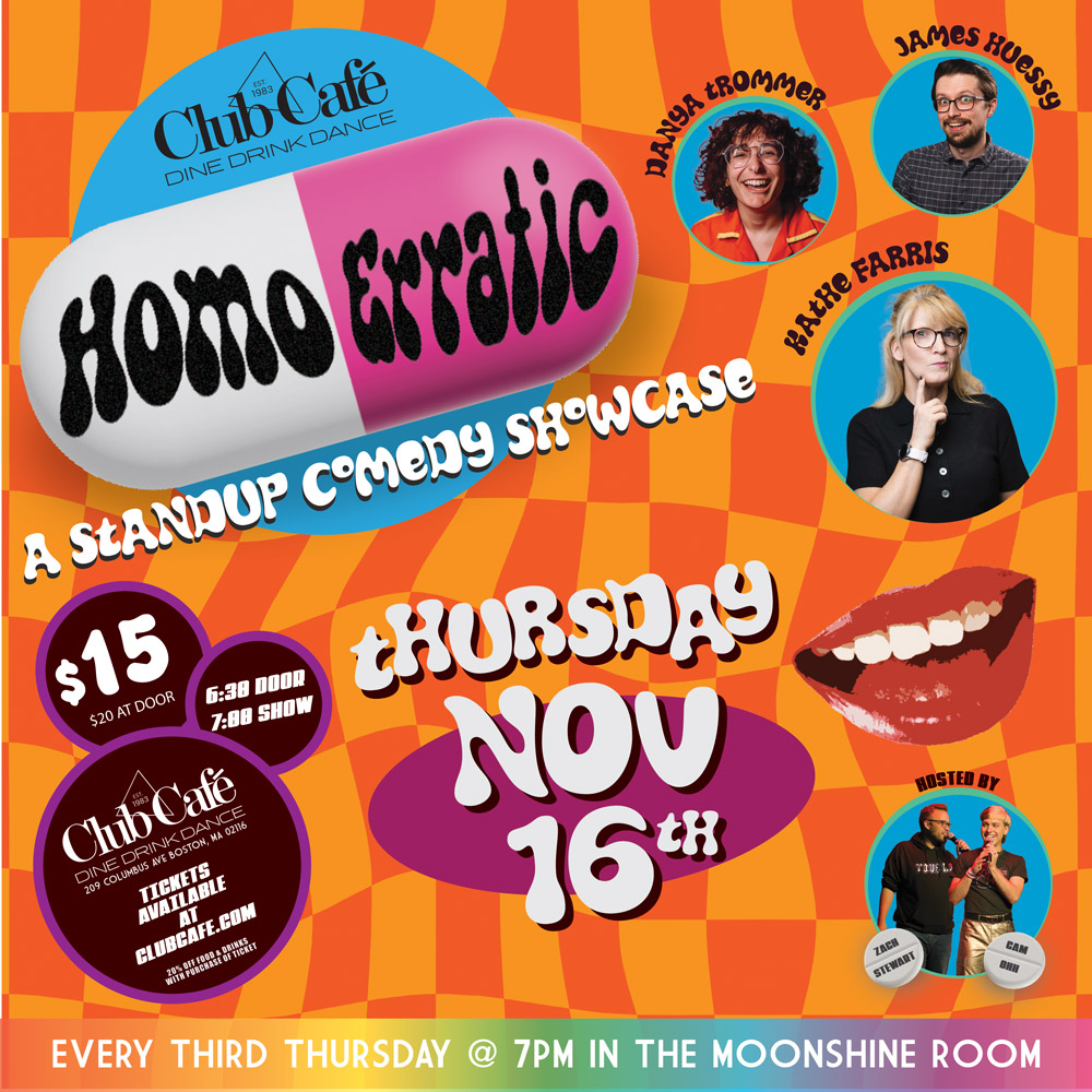 Queer comics Cam Ohh and Zach Stewart host Boston’s best stand-up comedians at Club Cafe for a night of hilarity and homosexual behavior