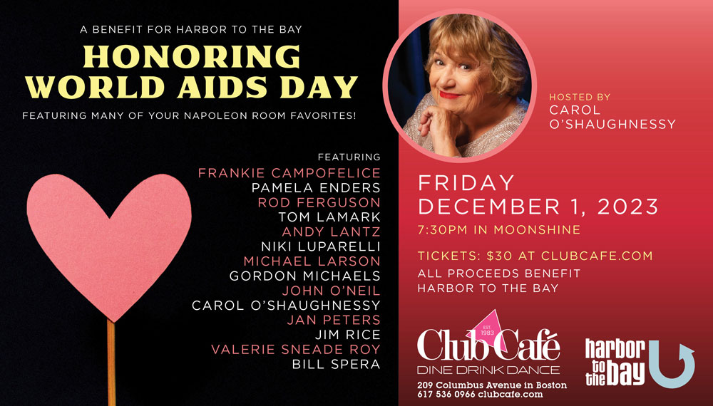 HONORING WORLD AIDS DAY is a benefit for Harbor to the Bay hosted by CAROL O’SHAUGHNESSY and featuring many of your Napoleon Room Favorites. All Proceeds will benefit Harbor to the Bay.