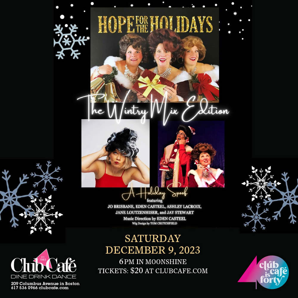 Come in from the weather and mingle and jingle with the newest edition of Hope for the Holidays – The Wintry Mix Edition! Set somewhere in America in 1962, clueless tv hostess Hope Henderson (Jo Brisbane) presents her cabaret crew of characters including: Misty Tinsel (Eden Casteel), the Sugar Sisters – Candy (Ashley LaCroix) and Taffy (Jane Loutzenhiser); and their shared love, Binaca the Bartender (Jay Stewart). It’s a love quadrangle and Santa saves the day, as he always does. Holiday tunes both familiar and obscure, both heartfelt and irreverent, are sung by the questionable quintet. Jealousy and joy, fueled by Christmas cocktails – becomes a wild wintry mix.
