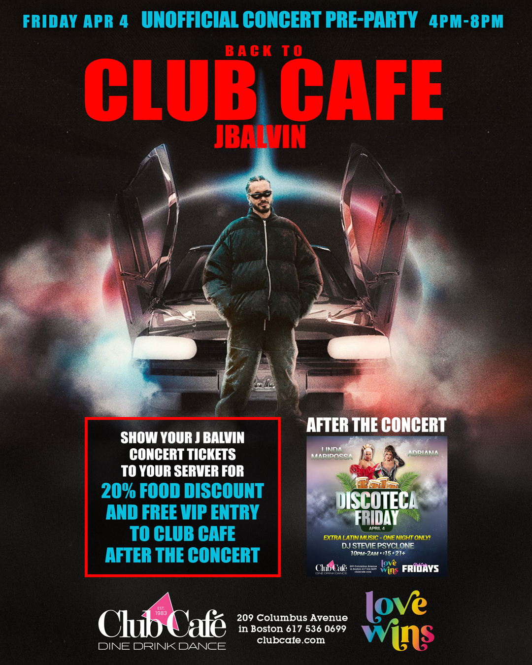 Show your J Balvin concert tickets to your server for a 20% food discount and free VIP entry to Club Café after the concert.