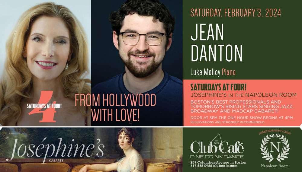 JOSEPHINE’S in the NAPOLEON ROOM – Boston’s best professionals and tomorrow’s rising stars singing JAZZ, BROADWAY & MADCAP CABARET! Doors open at 3pm and the one hour show begins at 4:00 pm. RESERVATIONS strongly recommended.