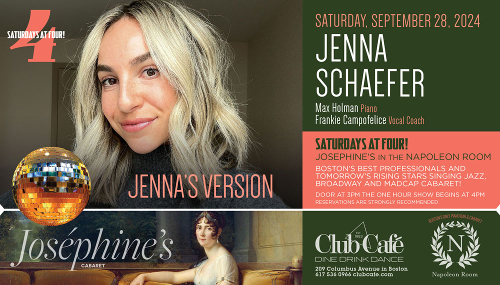 JOSEPHINE’S in the NAPOLEON ROOM – Boston’s best professionals and tomorrow’s rising stars singing JAZZ, BROADWAY & MADCAP CABARET! Doors open at 3pm and the one hour show begins at 4:00 pm. RESERVATIONS strongly recommended.