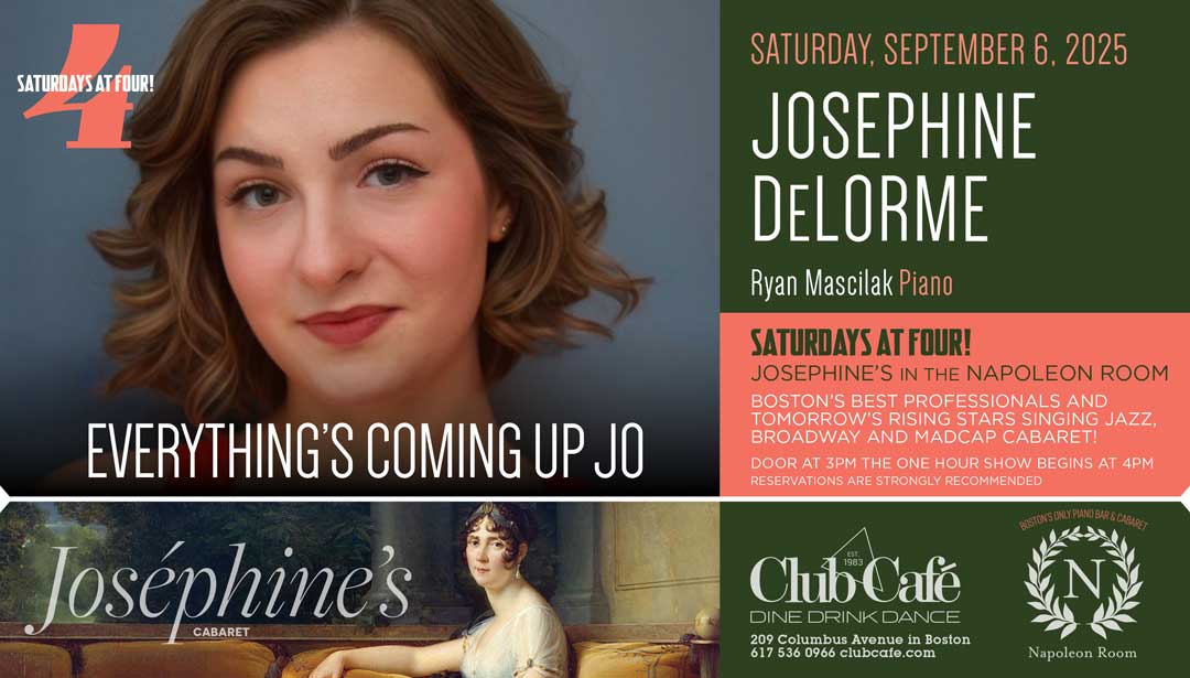 JOSEPHINE’S in the NAPOLEON ROOM – Boston’s best professionals and tomorrow’s rising stars singing JAZZ, BROADWAY & MADCAP CABARET! Doors open at 3pm and the one hour show begins at 4:00 pm. RESERVATIONS strongly recommended.