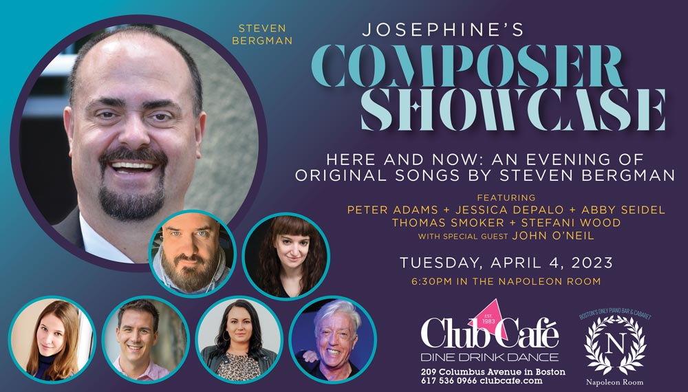 Join composer STEVEN BERGMAN for a musical trip throughout history, as he features music from his original catalogue. This musical journey will take the audience from Victorian England (Jack the Ripper: The Whitechapel Musical premiered by Centastage and the FUDGE Theater), to the Gilded Age (the premiere of songs from his latest score, Hannah and Margaret), the world of Shakespeare (Comedy of Errors at Lyric Stage Company) and the breaking of the Curse of the Bambino (premiered at the Lyric Stage Company) plus a few surprises. Featured performers include Peter Adams, Jessica DePalo, Abby Seidel, Thomas Smoker, and Stefani Wood, with special guest John O’Neil.