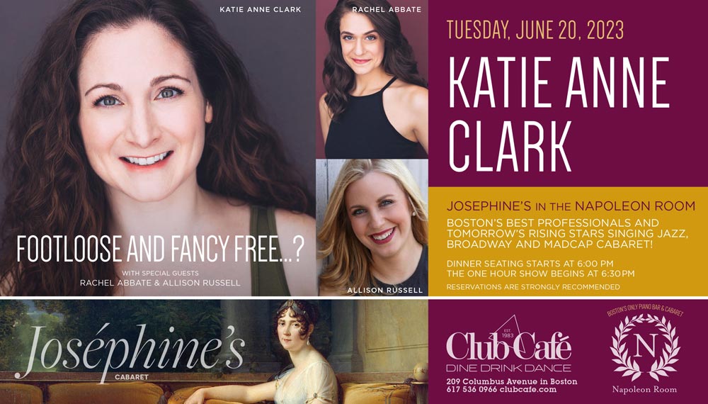 JOSEPHINE’S in the NAPOLEON ROOM – Boston’s best professionals and tomorrow’s rising stars singing JAZZ, BROADWAY & MADCAP CABARET! Dinner seating starts at 6:00 pm and the one hour show begins at 6:30 pm. RESERVATIONS strongly recommended.