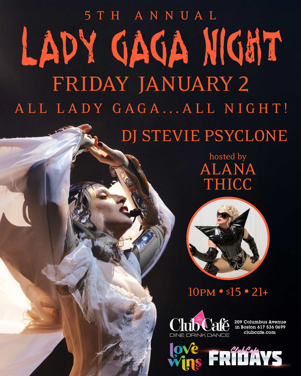 5th Annual LADY GAGA NIGHT – All Lady Gaga all night! Hosted by DJ STEVIE PSYCLONE! Join us at Club Café as we kick off the weekend.