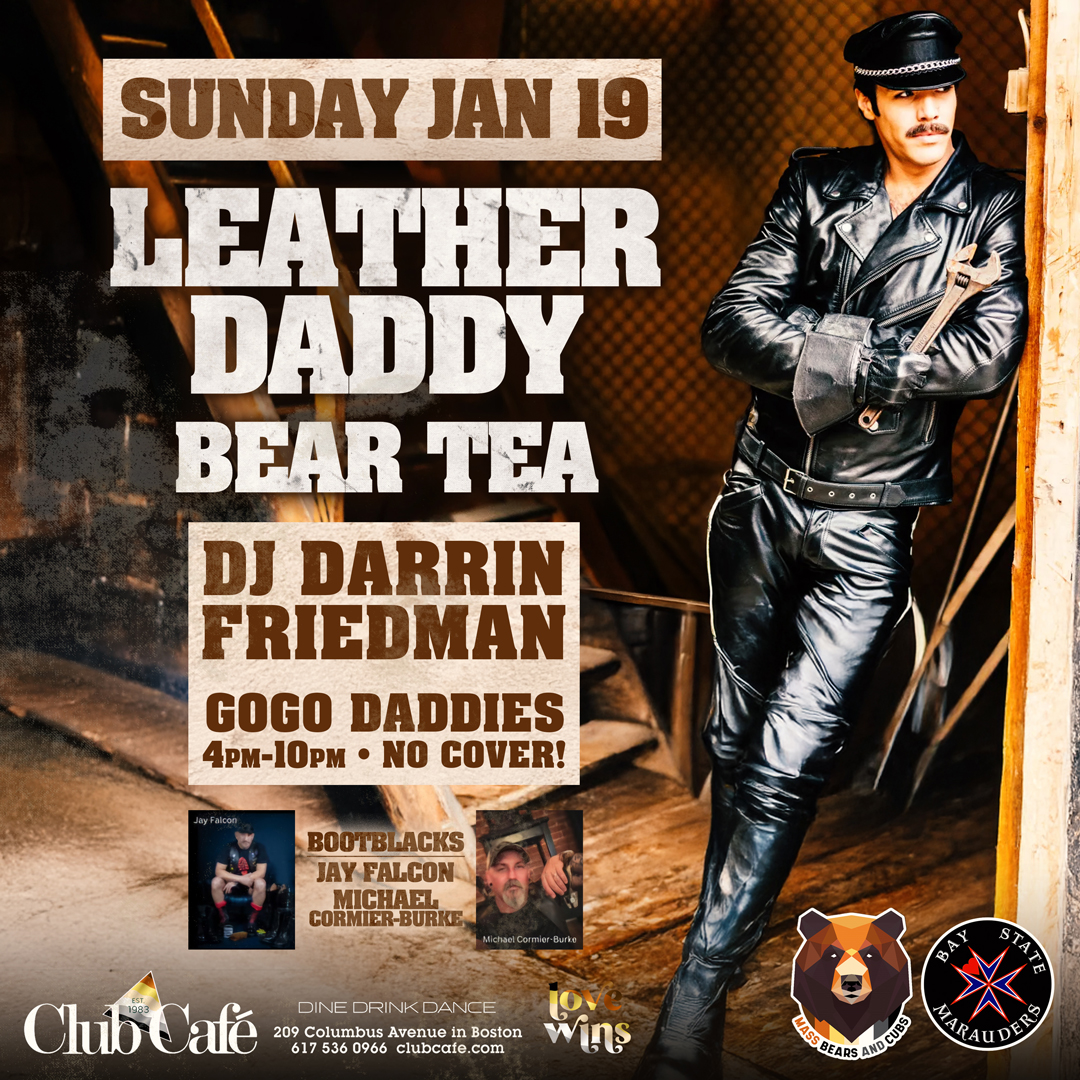 LEATHER DADDY BEAR TEA – Club Café welcomes the Bear and Otter community on the 3rd Sunday every month. Music by DJ DARRIN FRIEDMAN. No Cover. G0-G0 Daddies – 21+