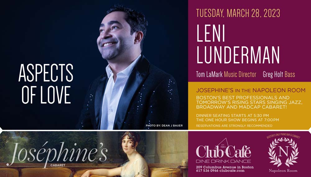 JOSEPHINE’S in the NAPOLEON ROOM – Boston’s best professionals and tomorrow’s rising stars singing JAZZ, BROADWAY & MADCAP CABARET! Dinner seating starts at 5:30 pm and the one hour show begins at 7:00 pm. RESERVATIONS strongly recommended.
