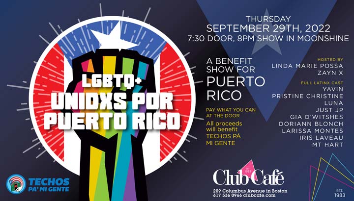A Benefit Show for PUERTO RICO Hosted by LINDA MAIRE POSSA & ZAZYN X with a full Latin cast. Pay what you can at at the door. All proceeds will benefit TECHOS PA MI GENTE.