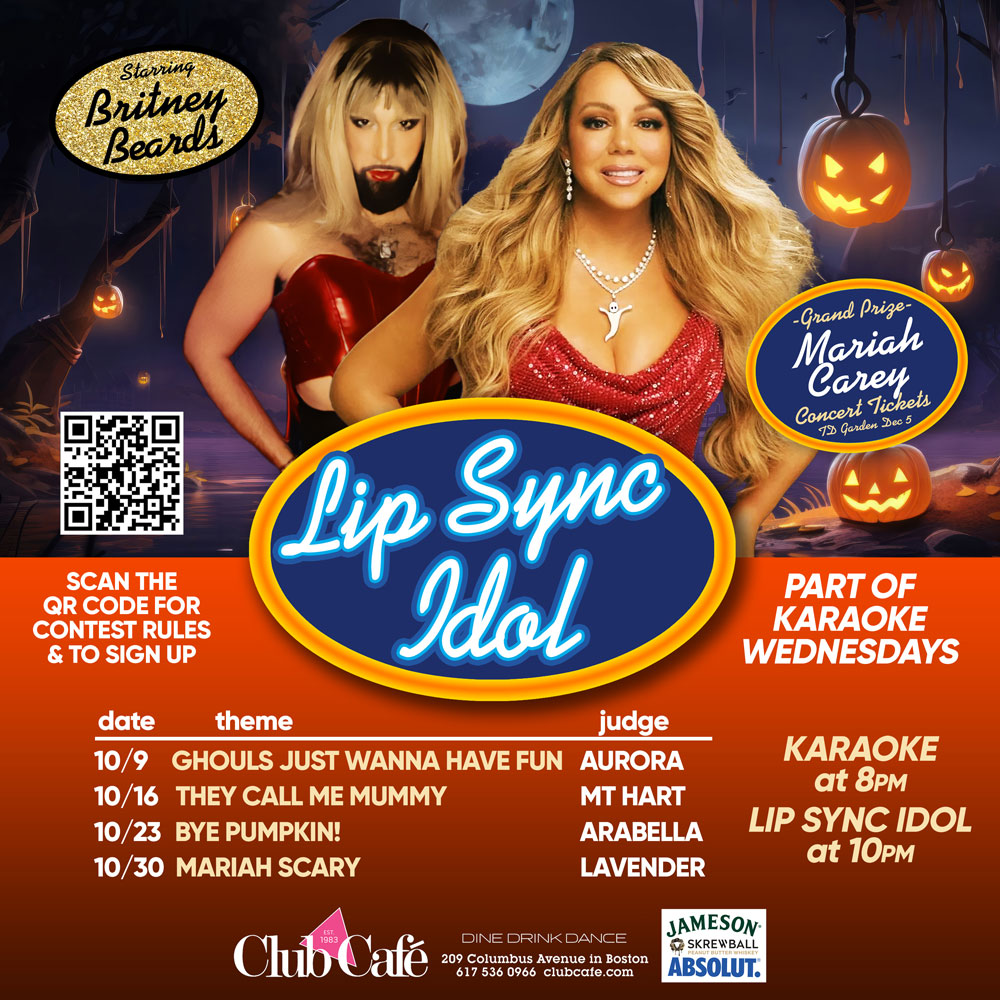 Starring BRITNEY BEARDS. Every Wednesday in the middle(10pm) of Karaoke Wednesdays (8pm-12am) and as always, Karaoke will resume after Lip Sync Idol. Grand prize is Mariah Carey Concert tickets! For full rules check out https://www.clubcafe.com/lip-sync-rules/