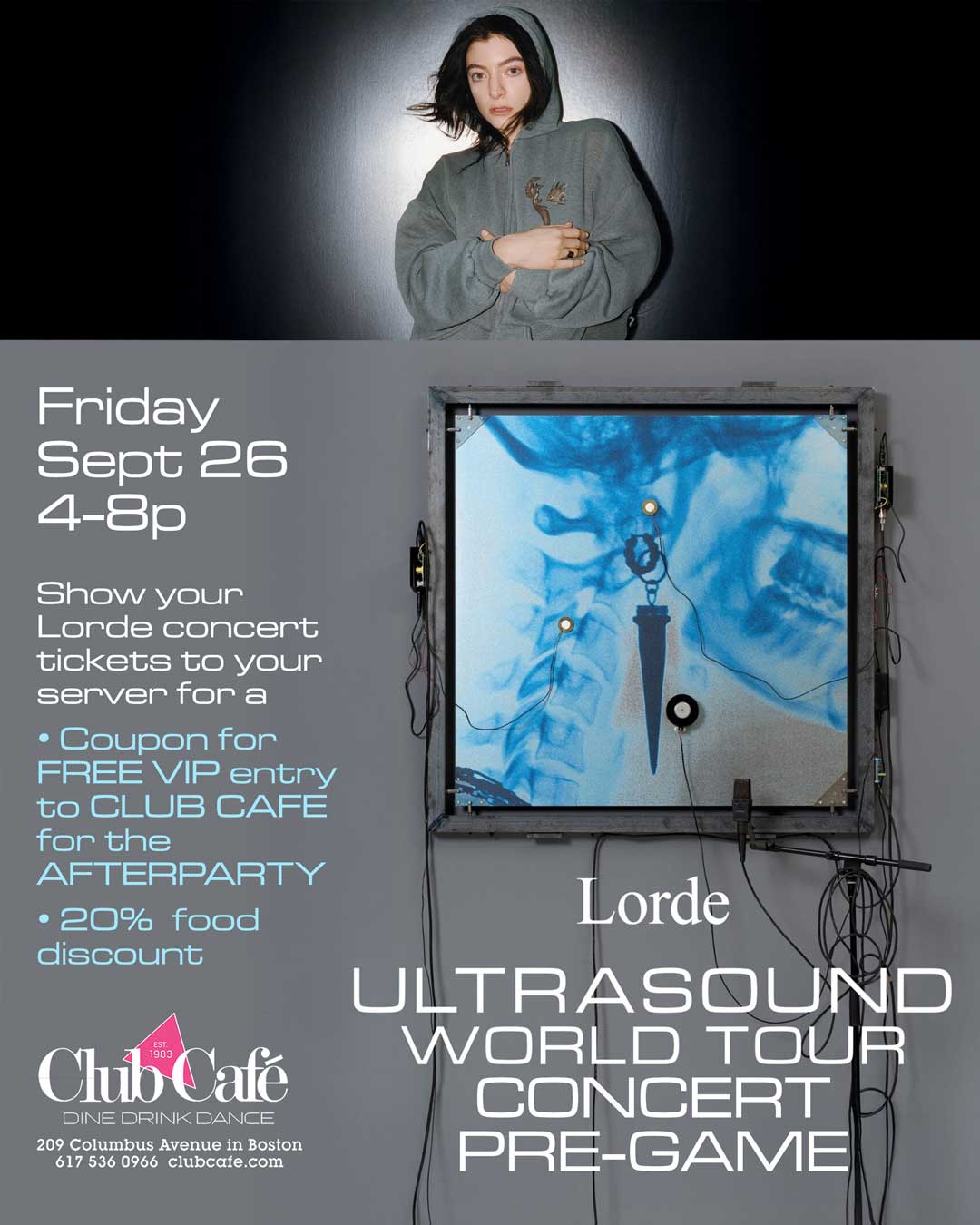 LORDE ULTRASOUND CONCERT PRE-PARTY. Show your Lorde concert tickets to your server for a 20% discount on your food. Includes a coupon for FREE VIP entry to Club Café for the AFTERPARTY