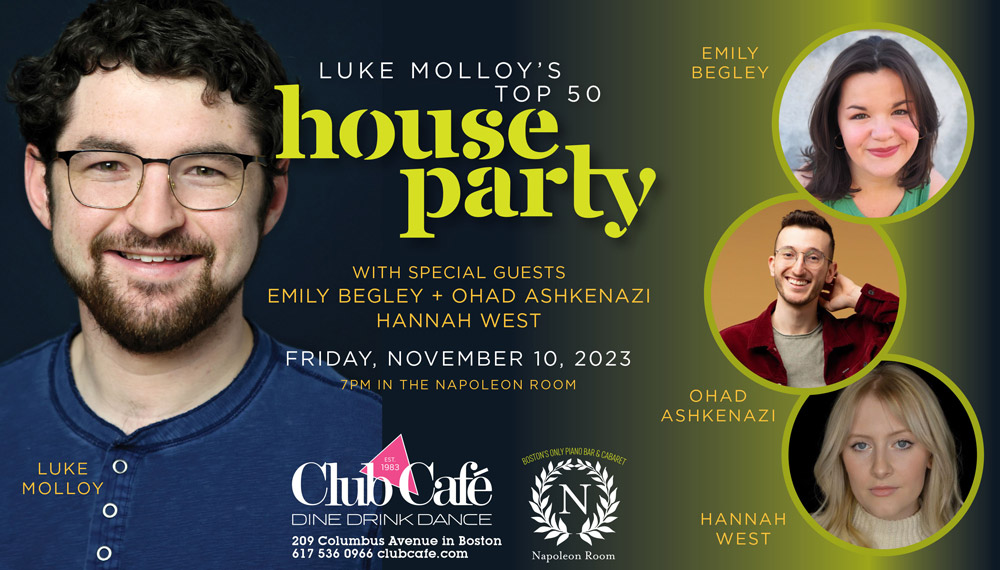 LUKE MOLLOY returns to Club Café after a 15 month hiatus with another house party! Featuring his top 50 most listened songs of all time, he is joined by some of his favorite singers, Emily Begley, Ohad Ashkenazi, and Hannah West to perform songs from across the spectrum: Taylor Swift to ABBA, Paul Simon to Fleetwood Mac, the Goo Goo Dolls to The 1975, Stephen Sondheim, and Jackson Browne. You won’t want to miss it!