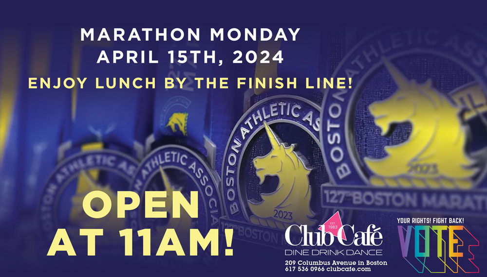 Home Events Marathon Monday Marathon Monday reservationsDine With Us. Enjoy Lunch by the Finish Line! We are open at 11AM Date Apr 15 2024 Expired! Time 11:00 am - 5:00 pm Cost No cover Location Club Café Boston 209 Columbus Avenue, Boston, MA 02116 Website https://www.clubcafe.com/ Category Featured Restaurant Feature