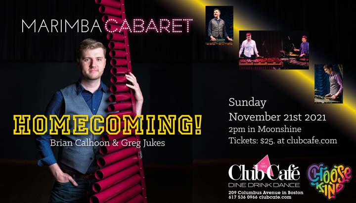 Brian Calhoon and Greg Jukes are reunited and thrilled to come back to the place where Marimba Cabaret was born: Club Café! “Homecoming” will celebrate the return of this talented percussion duo with beloved covers for marimba and voice and new tunes inspired by the past season of porch concerts in Provincetown. Marimba Cabaret is an evening of songs and stories featuring show tunes and pop songs re-imagined for marimba, vibraphone, drums, and voice. Brian Calhoon sings and plays marimba with his right hand man, Greg Jukes, on vibes and drums. Winner of the 2017 Critics’ Choice Award at PortFringe Theater Festival, Marimba Cabaret invites you to reconnect with live performance and with yourself in a one-of-a-kind show.