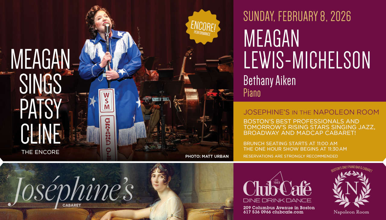 After a sold out performance last November, Meagan brings her Patsy Cline show back to Josephine’s. Meagan has blissfully donned Patsy Cline’s cowboy boots in multiple productions of Always…Patsy Cline around the country. She has been lauded as “magnificent as Cline,” “pure magic,” and having “the singing chops and luminous stage presence to deliver such classic[s] as ‘Crazy’ and ‘I Fall to Pieces.’” Join us as we turn the Napoleon Room into the honkytonk, celebrating “The Cline” more than 60 years after the peak of her radiant, though tragically short career. Meagan will be accompanied Bethany Aiken