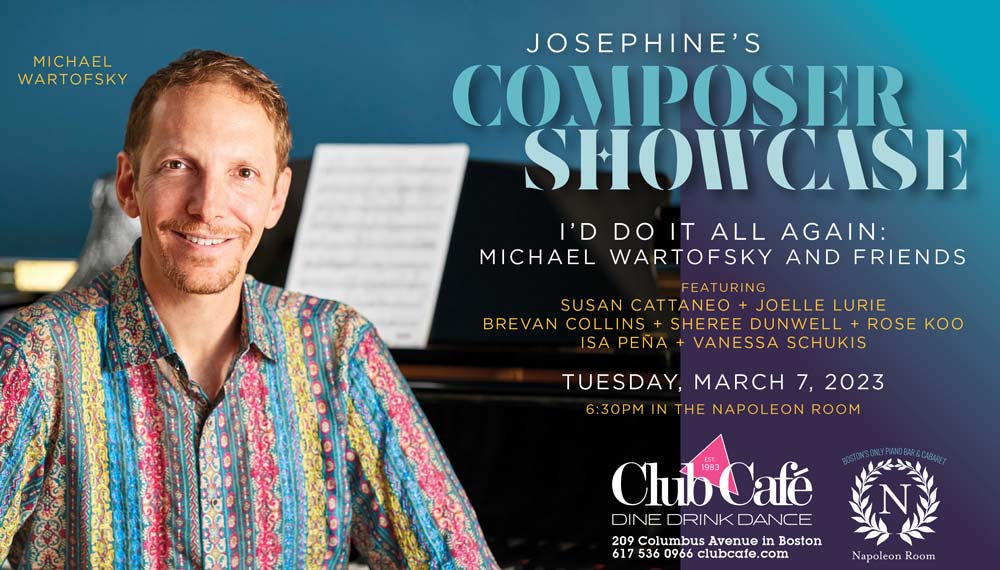Join contemporary musical theater composer-lyricist MICHAEL WARTOFSKY for an evening of originals about making choices, believing in yourself, and loving courageously. Professor of Songwriting at Berklee, Wartofsky will interweave selections from his album “All the Possibilities: Broadway Sings Wartofsky,” his recent musicals LATE (Moonbox Productions’ Boston New Works Festival) and Cupcake (GBA Productions, Club Café), plus brand new fare including co-writes with special guests Susan Cattaneo (Boston Music Awards nominee) and Joelle Lurie (Sister Act, Lyric Stage). Other featured guests will include Brevan Collins (LATE), Sheree Dunwell (Ain’t Misbehavin’, Central Square Theater), Rose Koo (LATE), Isa Peña (American Idol Season 18), and Vanessa Schukis (Boston’s Nunsense).