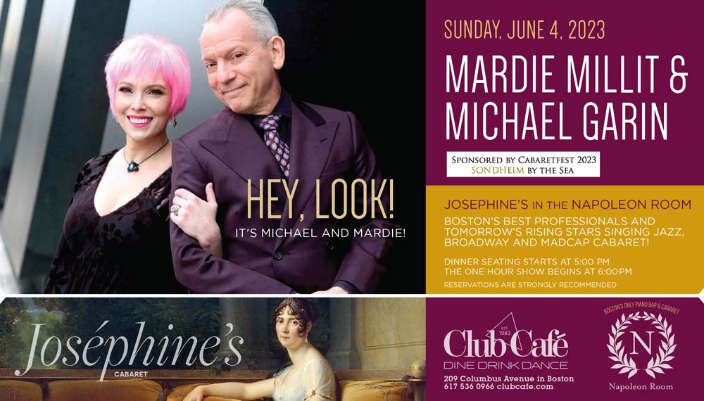 New York City piano/vocal duo Michael Garin and Mardie Millit have been known to stir up delicious mayhem wherever they go. For years they’ve held forth in some of Gotham’s swankiest and most notorious clubs and boîtes, from the VIP Room at Limelight to The Monkey Bar and Elaine’s. In their first Boston appearance, Michael & Mardie bring their patented fizzy cocktail of musical virtuosity and goofy charm to this evening of standards, showtunes, original songs, surprises and laughs. From Cole Porter to Porter Waggoner, and from Sondheim to the Great World Songbook, the multi-award-winning husband and wife team who have been described as “Steve & Eydie meet the Three Stooges” bring you a tidal wave of musical innuendo, pick-up lines and clever repartee that goes down with surprising ease.