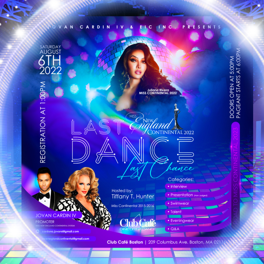 Home Events Miss New England Continental 2022 Miss New England Continental 2022 reservationsDine With Us. Last Dance! Last Chance! Ticket Link: https://www.eventbrite.com/e/miss-new-england-continental-tickets-374732534097 Date Aug 06 2022 Expired! Time Doors open at 5:00 pm 8:00 pm - 9:30 pm Cost $25 - $100 More Info Buy Tickets Location Moonshine Room 209 Columbus Avenue, Boston, MA 02116 Website https://www.clubcafe.com/ Category Nightclub Feature Ticketed Events Buy Tickets
